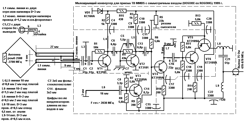 Этот конвертер предназначен для приема ТВ MMDS на простую ромбическую антенну. Симметрия входа обеспечивается с помощью двух линий. Первая образована двумя отрезками медной трубки 3 мм диаметром (капиляр), с зазором 3 мм между ними, замкнутая на конце (впаяны в боковую стенку коробки). Вторая линия коаксиально расположена внутри одного из капиляров и изготовлена из медной проволоки 1,2 мм диаметром и изолированна фторопластовой лентой навитой на него. Через отверстие в капиляре она с помощью хомута соединяется со вторым капиляром. После согласования, перемещением хомута, он фисируется на капиляре пайкой. Эти линии вместе трансформируют высокое сопротивление ромбической антенны в единицы ом входного сопротивления транзистора VT1. Конденсаторы С7 и С14 конструктивные. С7 изготовлен из 1,5 мм двухстороннего стеклотекстолита размером 3х5 мм и впаян между базой VT2 и платой. С17 флажок из жести, 3х3 мм до загиба и 2х7 мм для припайки, расположен возле эммитерного вывода сопротивления R9. Регулировкой связи флажка С14 и подстроечником R5 устанавливается оптимальный режим смесителя VT4. Частота гетеродина VT3 выставляется подгибанием линии L6 к земле. Транзистор КТ3109А в гетеродине - это не ошибка, как оказалось, он легко генерирует на частотах до 2500 МГц! Все детали, подключенные за проходными конденсаторами, расположенны в подвале с другой стороны платы. См. "Доработка проходных конденсаторов". Напряжение питания +12 в подается по сигнальному кабелю через LC фильтр аналогичный L9C21 конвертера. 73! UO5OHX ex RO5OWG 1999 г.