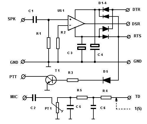 Данный модем подключается к порту RS-232 и питается непосредственно от него (сигналы RTS и DTR) и не требует дополнительного питания операционного усилителя. Диодный мост служит для обеспечения питанием в не зависимости от потенциалов на контактах RTS (Request to Send) и DTR (Data Terminal Ready). На вход операционного усилителя подаётся НЧ сигнал с выхода трансивера. Минимальный уровень данного сигнала должен быть не менее 100 мВ. Выходной сигнал с операционного усилителя поступает на контакт DSR (Data Set Ready). При передачи на соответствующий вход трансивера подаётся сигнал PTT. Положительное напряжение с линии RTS переводит транзистор Т1 в насыщенное состояние. В это время на микрофонный вход передатчика подаётся сигнал TD (Transmitteg Data), что становится причиной модуляции несущей. Цифровой сигнал при помощи RC фильтра меняется на синусоидальный, а потенциометр РТ1 помогает установить на выходе соответствующую амплитуду сигнала в зависимости от чувствительности микрофонного входа передатчика.
