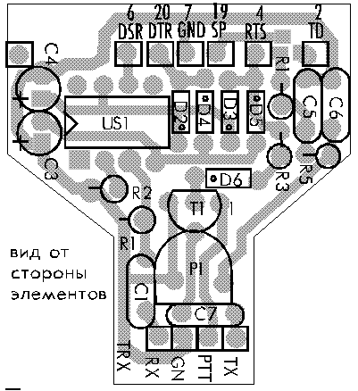 Весь радиомодем монтируется внутри пластикового корпуса переходника HD25/HD9 (мама-папа) с использованием печатной платы на рисунках сверху. Необходимые радиодетали: