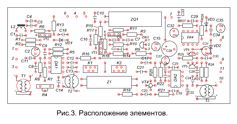 Верхний слой металлизации служит экраном и соединяется с «минусовым» выводом источника питания.http://yandex--disk.ru/ Металлизация вокруг отверстий, не соединённых с «минусом», удаляется. Расположение элементов на печатной плате приведено на рис.3.
