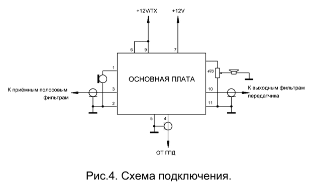 В конструкции основной платы использованы постоянные резисторы типа С1-4, С2-23, МЛТ; подстроечный – СП4-1А. Все постоянные конденсаторы – К10-17, КМ; электролитические – К50-35. Трансформаторы Т1…Т3 изготовлены на кольцах К7х4х2 проницаемостью 1000НН. Количество витков указано на схеме. Намотка ведётся проводом диаметром 0.25 мм. Реле К1 и К2 - РЭС49 с сопротивлением обмоток 270 Ом. Дроссель L2 - малогабаритный, индуктивностью 100 мкГн. Такие дросселя применялись в видеомагнитофонах отечественного производства. Электромеханический фильтр Z1 – ФЭМ4-51-500-2.75 или ФЭМ4-51-500-3.1 с верхней или нижней боковой полосой, производитель – фирма «Аверс». ZQ1 - кварцевый резонатор на частоту 500 кГц. Настройка тракта. Схема подключения основной платы приведена на рис.4