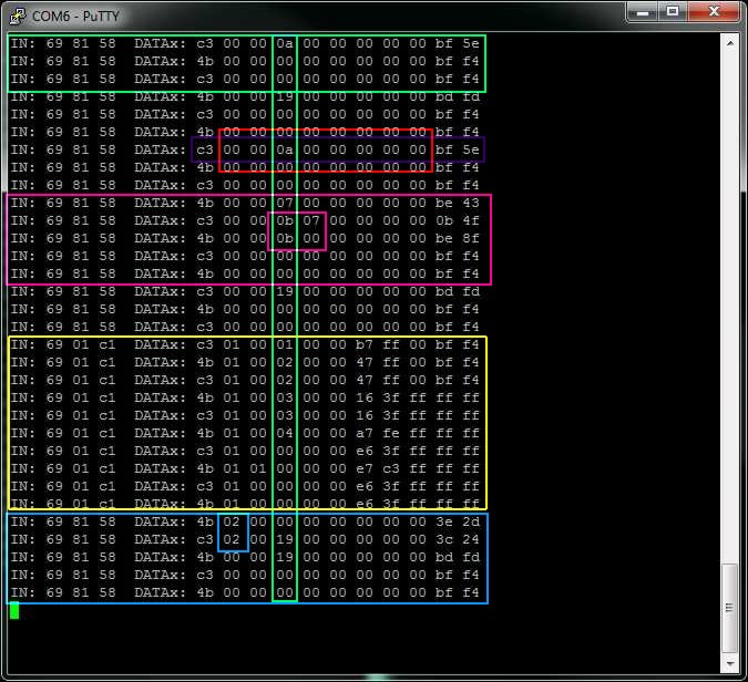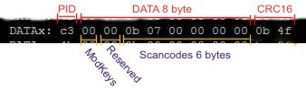 Проанализируем полученные данные. Для начала немного теории. Обмен между USB устройством ведется пакетами данных. Каждый пакет состоит из идентификатора пакета (PID) длиной 1-й байт и некоторых данных, зависящих от типа пакета. Обмен данными всегда инициализируется компьютером, т.е. компьютер сначала делает запрос на получение данных посылая пакет IN c PID = 0х69, а только затем устройство передает данные в пакете DATA0 PID=0xc3 DATA1 PID = 0x4b или не передает, если данных нет. Соответственно каждая строка в логе представляет из себя пару из запроса на получение данных, и ответа с передаваемыми данными. Запрос IN состоит из 3-х байт. 1-й это непосредственно идентификатор самого запроса. 2-й и 3-й байт содержат следующие данные: 7 бит – адрес устройства, получаемый им при подключении к шине, 4 бита – номер конечной точки и 5 бит контрольной суммы. Таким образом 2-й и 3-й байт запроса IN идентифицируют устройство, от которого будут получены данные. Так как я использовал составное устройство, то на логе видно, что обмен происходил с двумя устройствами: клавиатурой и мышью (отмечено желтой рамкой). Запрос типа DATA состоит из 11 байт (фиолетовая рамка), из которых первый содержит идентификатор пакета, а два последних – контрольную сумму. Байты со 2-го по 9-й содержат 8 байт данных (оранжевая рамка). Информация в байтах данных распределяется следующим образом: 1-байт содержит данные о нажатии модификационных клавиш (Alt, Shift, Ctrl, Win), 2-й байт не используется, с 3-го по 8-й содержат скан-коды нажатых клавиш.