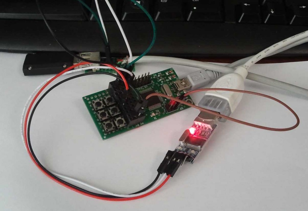 У меня возникла необходимость в некотором урезанном варианте KVM, для переключения USB клавиатуры с мышкой между компьютером и SmartTV на Андроиде. Готовые KVM меня не устроили т.к. мне не нужно было переключать видео сигнал, а главное, дешевые модели KVM для работы с USB клавиатурой не позволяли производить переключение по команде с клавиатуры а только кнопкой на самом устройстве. Для реализации такого устройства мне надо было перехватывать и анализировать нажатия клавиш и при появлении необходимой комбинации производить переключение между выходами. Поиск в интернете дал много вариантов реализации захвата нажатий клавиш для PS/2 клавиатуры в рамках устройств, называемых кейлоггерами. Для USB клавиатуры я ничего подобного на нашел. Если не считать варианта воткнуть клавиатуру в USB-PS/2 переходник, а дальше действовать по налаженной схеме. Основным препятствием, насколько я понял, была сложность протокола USB по с равнению с PS/2. Поэтому пришлось разрабатывать такое устройство самому. Данное устройство не является законченным кейлогером готовым к использованию. Это шаблон, на основе которого можно разрабатывать устройства, которые требуют перехвата данных передаваемых по шине USB от периферийного устройства к компьютеру. Здесь показывается способ перехвата нажатых клавиш и дальнейшая их передача в компьютер по протоколу UART. Аппаратная часть, использованная, для разработки представлена на фото.