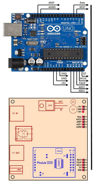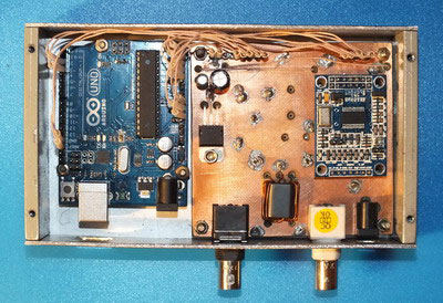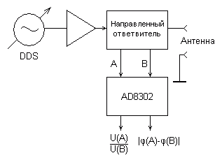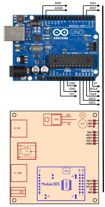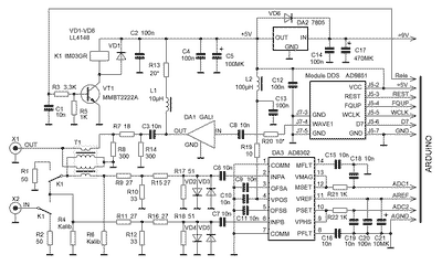 После этого краткого экскурса в историю перейдем к делу. Структурная схема антенного анализатора VNA показана на рисунке. Сигнал с генератора на основе DDS через направленный ответвитель подается в исследуемую антенну. Сигналы с датчика прямой и отраженной волны подаются на уникальную микросхему от Analog Devices – AD8302. На ее выходе формируются два аналоговых сигнала. Первый пропорционален отношению амплитуд входных сигналов, второй – разности их фаз. По этим двум значениям можно рассчитать все характеристики антенны, в том числе КСВ тракта, активную и реактивную составляющие входного сопротивления антенны. Комплектующие для этого антенного анализатора в общем-то достаточно редкие, но вполне доступные. Проблема в том, что найти все необходимые компоненты у одного продавца невозможно. А если приобретать в разных российских интернет магазинах, транспортные расходы становятся слишком большими. К счастью, есть Aliexpress и eBay. В общем, без помощи братского китайского народа я бы ничего не смог сделать. Как я уже писал, основное требование к этой конструкции – простота изготовления и минимальная стоимость. При сохранении необходимых метрологических характеристик, разумеется. Поэтому я использовал в конструкции два готовых модуля. Первый – это модуль синтезатора на основе DDS AD9851. На небольшой плате смонтирована микросхема синтезатора, тактовый генератор и вся необходимая обвязка. И стОит этот модуль в Китае дешевле одной микросхемы DDS в России. Второй модуль – «Arduino Uno». Это популярная отладочная плата на основе микроконтроллера ATmega328. Она включает в себя микроконтроллер, всю необходимую обвязку и конвертер USB-COM для связи с компьютером. И опять же его стоимость в Китае соизмерима со стоимостью одного микроконтроллера в России… А вот измерительный модуль пришлось собирать самостоятельно. Его схема показана на рисунке. Сигнал с модуля DDS подается на монолитный усилитель DA1 типа GALI производства Mini-Circuits. Важнейшая часть измерительного модуля – направленный ответвитель T1. От его качества зависит точность и частотный диапазон анализатора. Это так называемый «Tandem Match» – трансформатор на двухдырочном бинокле. Подробно методика изготовления «Tandem match» описана в статье в упоминавшемся выше журнале Funkamateur и в pdf файле, ссылка на который в конце этой странички. К разъему X1 подключается антенна. В показанном на схеме отключенном состоянии реле K1 сигналы прямой и отраженной волны с направленного ответвителя через аттенюаторы 10 db на резисторах R9, R10, R15 и R11, R12, R16 подаются на входы DA3 AD8302. Аттенюаторы нужны для исключения перегрузки AD8302. Этот антенный анализатор можно использовать и для исследования амплитудно-частотных характеристик электрических цепей. При включенном состоянии реле K1 сигнал с разъема X1 может быть подан на исследуемую цепь, сигнал с выхода этой цепи подается на разъем X2. Таким образом можно настроить полосовой фильтр, снять характеристику кварца и т.п. Аналоговые сигналы, пропорциональные отношению амплитуд и разности фаз прямой и отраженной волны с выхода DA3 подаются на АЦП микроконтроллера ATmega328 в модуле Arduino Uno. Учитывая, что ноутбук в наше время перестал быть роскошью, я решил на первом этапе отказаться от собственного индикатора в этом антенном анализаторе. Вся информация выводится на экран ноутбука, к которому анализатор по