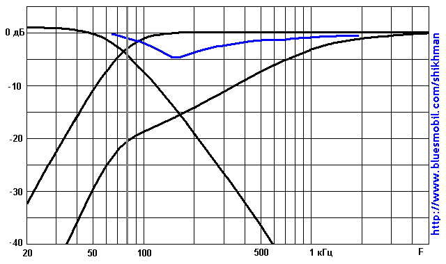 На графике черным цветом показана АЧХ сабвуферного канала с частотой среза 80 Гц и АЧХ ФВЧ в двух крайних положениях регулятора. А синим - результирующая АЧХ в одном из его промежуточных положений. Результат налицо - в интересующей нас области около 150 Гц появился провал нужной величины. Полоса частот сабвуфера при этом осталась в разумных границах и о "заднем" басе беспокоиться не нужно. И волки сыты, и овцы целы. Кроме того, в зоне работы звена первого порядка фазочастотная характеристика гораздо пристойнее, чем у классического фильтра третьего порядка.