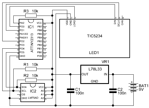Для отображения температуры применён жидкокристаллический индикатор TIC5234. При передаче данных на индикатор первым передается самый старший бит, управляющий сегментом 49. Затем передается бит сегмента 48, и так далее, пока не передадутся все биты. После этого нужно защелкнуть регистр, установив LOAD в лог. 0. При этом выбранная конфигурация сегментов отобразится на индикаторе. Лог. 1 соответствует включенный сегмент, Лог. 0 - выключенное состояние. Прибор питается от 9ти вольтовой батарейки "Крона". Для снижения напряжения применён стабилизатор L78L33 c напряжением на выходе 3.3 Вольта и максимальным током 100 мА. Чертёж платы изображен на рис. 3. Также на плате расположен разъём для внутрисхемного программирования.