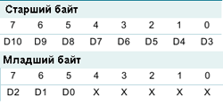 Управляет термометром микроконтроллер ATtiny2313, настроенный на работу с тактовой частотой 1 МГц от внутреннего генератора. Для измерения температуры применён цифровой датчик LM75AD с интерфейсом I2C. В соответствии со спецификацией линии I2C микросхема LM75AD имеет семиразрядный адрес. Старшие четыре разряда адреса установлены жестко: 1001, три младших задаются на выводах A0, A1, A2, подачей на них логических 0 или 1. В LM75AD входят регистр-указатель, код которого выбирает нужный регистр данных и четыре регистра данных. Код 0x00 выбирает двухбайтовый регистр температуры, который работает только на чтение, в нём хранится код текущей температуры. В табл. 1 приведено размещение данных в этом регистре. Если в температурном регистре бит D10 равен 0, то температура больше 0 и рассчитывается по формуле T=(Temp_data) x 0.125.