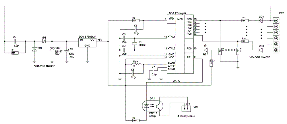 Аналого-цифровое преобразование производится с помощью АЦП, интегрированного в МК ATmega8. Для измерения действующего значения переменного напряжения реализован алгоритм детектирования пика синусоидального сигнала и его последующее умножение на амплитудный коэффициент синусоиды. Питание модуля измерения и передачи производится через бестрансформаторный блок питания от первого канала измеряемого напряжения. При падении напряжения на этом канале ниже уровня 90В модуль отключается. Светодиод HL1 служит для индикации процесса передачи информации приёмному модулю.
