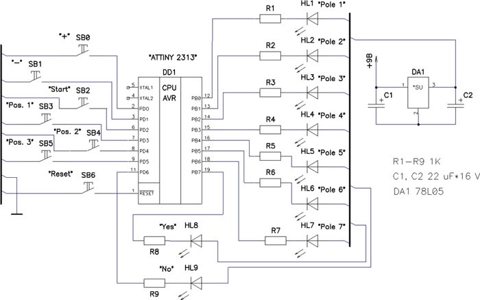 Это электронное устройство моделирует игру Наперстки. В качестве наперстков используются светодиоды. Ведущим игроком выступает микроконтроллер. Игровое поле состоит из 7-ми светодиодов и расположено в три ряда (рис. 2). Центральный ряд олицетворяет наперстки, которые в процессе игры переставляются. Остальные светодиоды используются для обозначения направлений перестановки. Смысл игры заключается в том, чтобы отследить движение исходного светодиода (шарика) и определить его положение в конце перестановок. Игра имеет 7 уровней сложности, которые различаются между собой числом и скоростью перестановок. При старте устройства с помощью светодиодов индицируется текущий уровень сложности. Информация о нем сохраняется в энергонезависимой памяти микроконтроллера. На рисунке представлена принципиальная схема устройства. Кнопки + SB0 и - SB1 используются для изменения уровня сложности. Кнопка Start SB2 служит для начала процесса игры. Кнопки Pos.1 SB3, Pos.2 SB4, Pos.3 SB5 предназначены для выбора положения искомого светодиода в конце цикла перестановок. Кнопка Reset SB6 осуществляет сброс микроконтроллера. Светодиоды Pole 1-Pole 7 HL1-HL7 составляют игровое поле, где HL1-HL3 средний ряд, HL4-HL5 верхний ряд, HL6-HL7 нижний ряд. Светодиоды Yes HL8 и No HL9 служат для индикации правильности ответа игрока.
