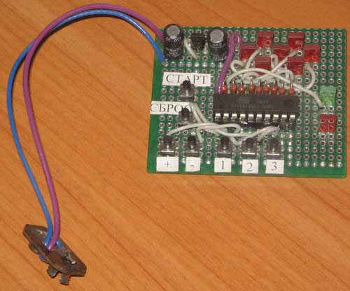 Игровой процесс выглядит следующим образом: В устройстве используется микроконтроллер ATTINY 2313 [2]. Фьюзы настраиваются на работу от внутреннего RC генератора с частотой 8 МГц (CKSEL3-0 равны 0100). Для повышения надежности работы с данными EEPROM задействован BOD детектор на уровень напряжения 4.3 вольта. Для его включения необходимо присвоить значение 100 фьюзам BODLEVEL 2-0. Также необходимо отключить деление тактовой частоты на 8 (CKDIV8 равен 1). На рисунке 2 представлена фотография устройства собранного на макетной плате.