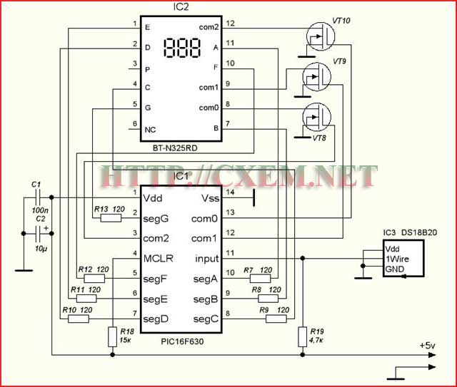 Хочу предложить для повторения простой термометр на датчике DS18B20 (DS18S20) и PIC16F630. Источник питания любой от 4 до 5 вольт (но стабилизированный). Индикатор с общим катодом (но можно сделать и общий анод). Резисторы в сегментах можно изменять в диапазоне 82...150 ом. Ключи на МОСФЕТах легко заменить на NPN транзисторы (в макете стоят обычные КТ315 с базовыми делителями). По просьбам трудящихся можно увеличить число датчиков, но не более 3-х (иначе не хватит 14 выводов МК). Так же можно портировать решение на любой МК микрочипа с числом выводов не менее 14.