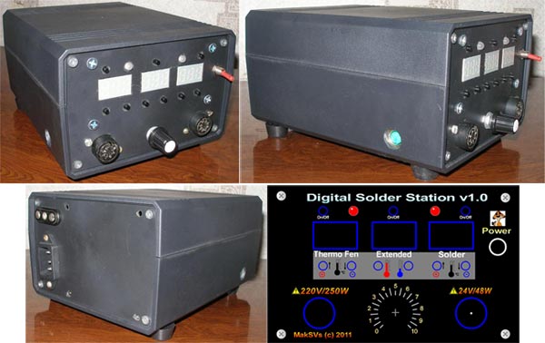 Работа с паяльной станциейСветодиоды: при нагревании до заданной температуры горит [красныйk светодиод, если температура находится в пределах +/-5 градусов от заданной горит [зеленыйk светодиод, если температура превышает заданную более чем на 5 градусов мигает [красныйk светодиод. В случае обрыва термопары попеременно мигает [красныйk и [зеленыйk и на индикаторе показывает [Errk (нагрузка при этом обесточивается). Паяльник: Работа с паяльником осуществляется 3-мя кнопками [Solder on/offk, [+5k, [-5k - при включенном паяльнике нажатие на [+5k, [-5k соответственно увеличивают/уменьшают заданную температуру о чем свидетельствует мигание индикатора. Фен: Работа с феном осуществляется 3-мя кнопками [Fen on/offk, [+10k, [-10k P- при включенном фене нажатие на [+10k, [-10k соответственно увеличивают/уменьшают заданную температуру о чем свидетельствует мигание индикатора; Переменным резистором (VR1) можно варьировать скорость вращения вентилятора фена. Распиновка выводов фена: Красный, Белый - Нагревательный элемент, 220В. Работа с внешней нагрузкой осуществляется 1-й кнопкой [EXT on/offk (кнопки [+k, [-k программно не задействованы). Переменным резистором (VR4) можно варьировать мощность в нагрузке от 0 до 99,9 %. ВНИМАНИЕ: Схема в [PROTEUSk кардинально отличается от оригинала и предназначена только для отладки и проверки работоспособности системы! Названия и номиналы деталей не совпадают! НалаживаниеНалаживаниеPустройстваPначинаютPсPпроверкиPмонтажа. Подаем питание и на индикаторах горят прочерки, затем мы одновременно нажимаем 4 кнопки [+10k, [-10k, [+5k, [-5k - Pв результате чего в EEPROM записываются стандартные значения температуры паяльника и фена равные 230 и 300 градусам соответственно и поправочные коэффициенты паяльника и фена равные 300 и 0 единицам соответственно (см. исходник) и мигнут все светодиоды. После этого включаем паяльник и ждем пока он прогреется. Показания температуры при этом не будут соответствовать действительности. Берем спичечный коробок и в углу паяльником расплавляем небольшое количество олова так, чтобы жало в него погрузилось. Сюда же окунаем термопару мультиметра и сравниваем показания. Вращением подстроечного резистора VR2 добиваемся одинаковых показаний на индикаторе и мультиметре. После этого, изменением [поправочного коэффициентаk добиваемся удержания температуры в заданных пределах. Настройку фена производим по аналогичной методике. Программа написана на [Сk с использованием компилятора CodeVision. Будет интересно услышать отзывы по поводу оптимизации кода или каких-то доработках. При разработке использовались следующие источники и программы: 1. Proteus 7.7 sp2 Автор конструкции и статьи Васильченко Максим aka MakSVs (Украина), e-mail: maksvs@bk.ru, ICQ: 321032970.