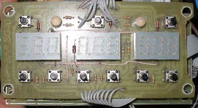 Блок управления и отображения информации: В устройстве используется 3 спаренных трехзнаковых семисегментника с общим катодом, выдранных из телефона [Русьk, 2 двухцветных светодиода, 9 кнопок управления (2 из которых не задействованы).