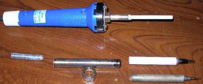 Паяльник: Паяльник как видно на фото рассчитан на 220В. [Made in Podvalk сгорел он у меня примерно через два дня. Потом на радиорынке я купил нагревательный элемент Lukey-SENSOTRONIK (для 702/898/852D+FAN) нагреватель 24В, 48ВтPPсо встроенной термопарой, но он оказался меньшего диаметра и длины, поэтому пришлось доматывать алюминиевую фольгу. Теплоотдача никакая, но хватает.