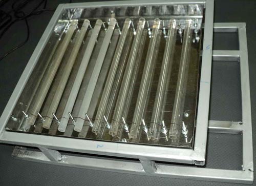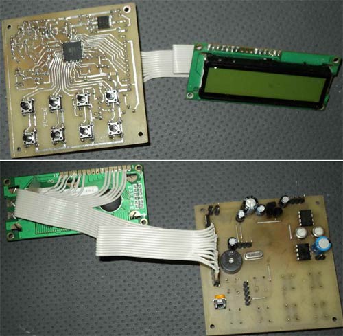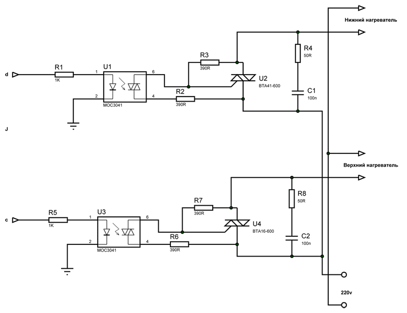 Каркас ( 370*330) мм нижняя часть и (330*330) мм верхняя часть, высотой 80 мм, сварен из метало-профильной трубы (15*15) мм, в середину помещён поддон из нержавеющей стали, (300*300) мм, с бортами 30 мм, в котором размещены девять кварцевых трубок (диаметром 10 мм и длинной 24,5 мм). В трубки продеты три спирали (мощность каждой 1КВт) , которые соединены параллельно. Для работы с небольшими платами ,одна спираль сделана коммутируемой . Трубки закреплены на болтах (3*25мм), вставленных в отверстия, просверленные в поддоне (на расстоянии 35 мм друг от друга и от края 40 мм) стальной вязальной проволокой (0,8 мм), расстояние между трубками и поддоном 10 мм. Для исключения прогиба сетки, между каждыми двумя трубками ,установлены поперечные опоры из нержавейки .Сверху поддон накрыт стальной решёткой ( диаметр очка 5 мм). Держатель верхнего нагревателя сделан из старого фотоувеличителя. Отражатель сделан из нержавеющей стали( 80*80*40) мм. Нагреватель состоит из четырёх кварцевых трубок (длинна 65 мм., диаметр 10 мм) скрученных вместе вязальной проволокой. Между трубками установлены шесть болтов( 3*50мм), для крепления к отражателю. Сквозь трубки продета нагревательная спираль (мощность 500 Вт). Перед установкой спирали следует разделить на равные части, для нижнего нагревателя на три, а для верхнего на четыре. Управление нагревателями осуществляется контроллером, собранном на одно кристальном микроконтроллере ATMEL ATMEGA16. Программа написана на С для CVAVR, прошить микроконтроллер можно программой PonyProg, с помощью программатора состоящего из 4-х резисторов, подключённых к LPT порту компьютера. Управляющие данные снимаются платиновым терморезистором Pt100 установленным в зоне пайки, и двумя термопарами, одна крепится к трубке нижнего нагревателя, установка второй не принципиальна, (например контроль температуры платы вне зоны пайки). С усилителей термопар и терморезистора, собранных на двух операционных усилителях LM358 (следует иметь в виду, что усилитель LM358 может имеет разбаланс по каналам), сигналы подаются на входы АЦП контроллера ATMEGA16. Управляющий ШИМ сигнал, через оптосимисторы MOC3041 подаётся на мощные симисторы, к выходам которых подключены нагревательные спирали.