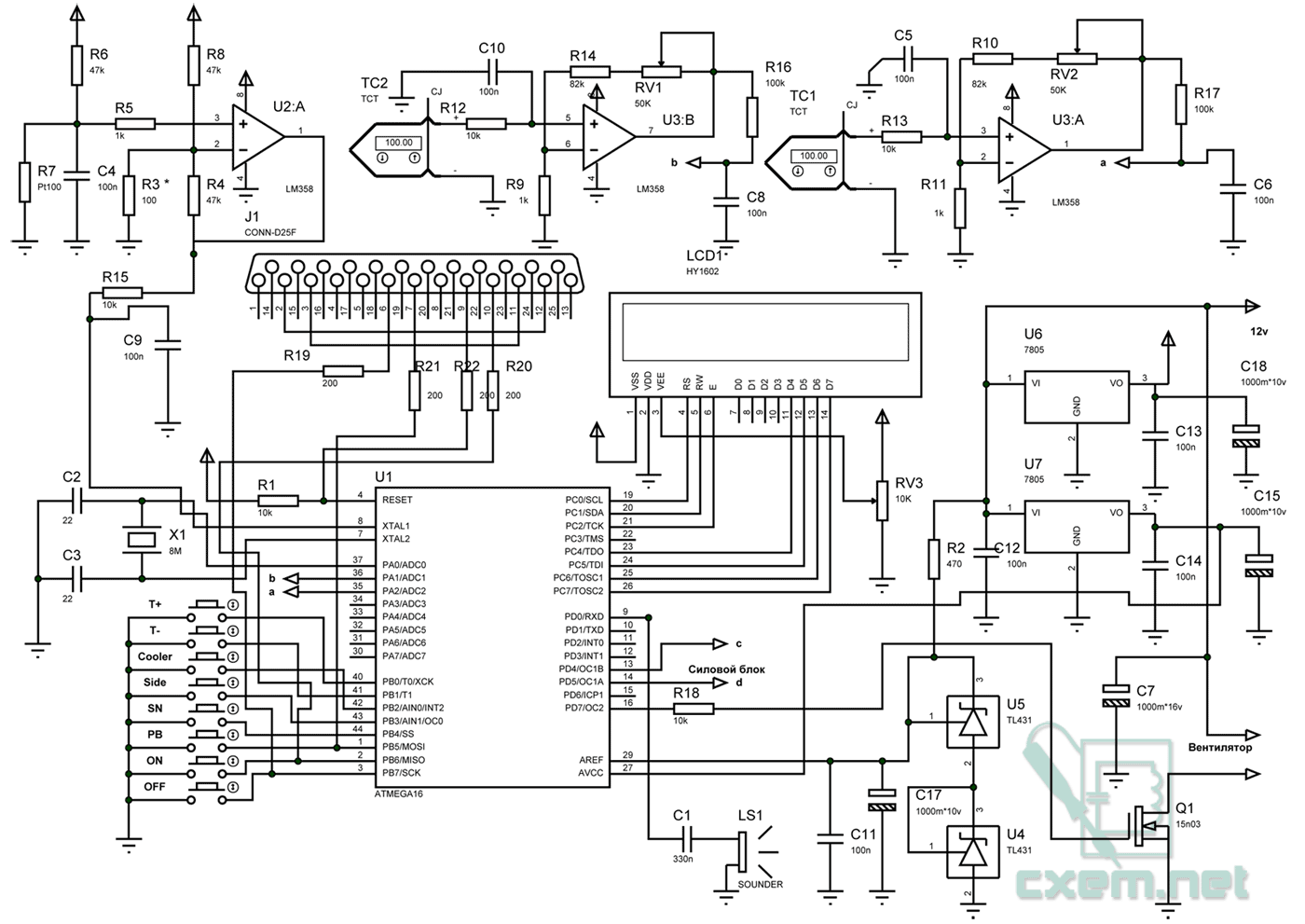 Питается контроллер от любого блока питания 12V 1A. Аналоговая и цифровая части контроллера питаются от двух стабилизаторов LM7805. Источник опорного напряжения для АЦП собран на двух регулируемых стабилитронах TL431 (можно заменить на один ref195, транзистор 15n03, управляющий включением вентилятора,на любой n канальный с управлением логическим уровнем ток не менее 0.5А). Кварцевый резонатор и конденсаторы С2,С3 можно не устанавливать. Управление режимами контроллера осуществляется с помощью клавиатуры: кнопки ON и OFF предназначены для включения и выключения рабочих режимов; Т+ и Т- для оперативного изменения пред заданных значений ;Pb и Sn для выбора одного из двух термопрофилей; Cooler - включение вентилятора; SD включение отдельно верхнего нагревателя, отдельно нижнего, либо обоих сразу. Термопрофиль имеет две режима, подогревный (только нижний нагрев) и основной (нижний поддерживает, а верхний доводит температуру до нужной) которые можно корректировать в процессе работы. Для быстрого охлаждения платы используется вентилятор на рабочее напряжение 12v, который включается вручную кнопкой Cooler, а выключается при снижении температуры ниже 40 С. Для установки пред заданных значений, необходимо удерживать кнопку PB нажатой, в течении 5 сек. Кнопка Cooler - следующий пункт, изменение значения Т+ и Т-.