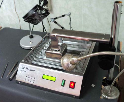 При ремонте материнских плат настольных компьютеров, ноутбуков, а в последнее время сложной радиоэлектронной аппаратуры, спаянной бессвинцовым припоем, имеющим температуру плавления 230 С, не обойтись без специальных приспособлений. На рынке предоставлено довольно много подобных устройств, от дорогих, которые не по карману небольшой мастерской, до дешёвых, китайских предназначенных максимум поджарить тост, но выход тем не менее есть - собрать станцию самому. Описание конструкции