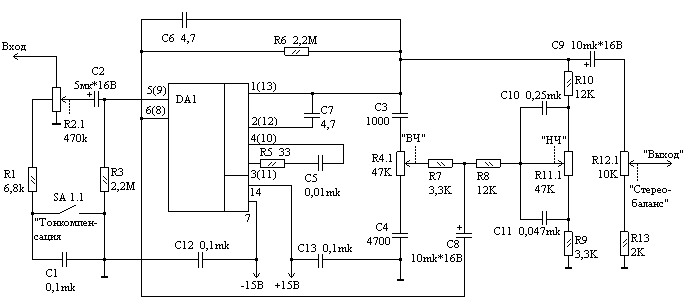 Мостовой регулятор тембра включен в данном случае в цепь ООС, охватывающей ОУ DA1.1 (здесь и далее в скобках указаны номера выводов второго ОУ микросхемы). На входе включен тонкомпенсированный регулятор громкости на переменном резисторе R2.1 с отводом от токопроводящего элемента. Тонкомпенсацию (подьем составляющих низших частот на малых уровнях громкости) можно отключить выключателем SA1.1. Устойчивую работу ИС КМ551УД2 (ее АЧХ имеет три перегиба) обеспечивают конденсатор С7 и цепь R5C5, номиналы которых, выбраны для коэффициента передачи Кu=10 (скорость нарастания выходного напряжения при таком усилении достигает 3...4 В/мкс).Конденсаторы С12, С13 предотвращяют взаимосвязь усилителя с другими устройствами тракта при питании от общего источника. Переменным резистором R12.1 (в другом канале R12.2) регулируют стереобаланс.