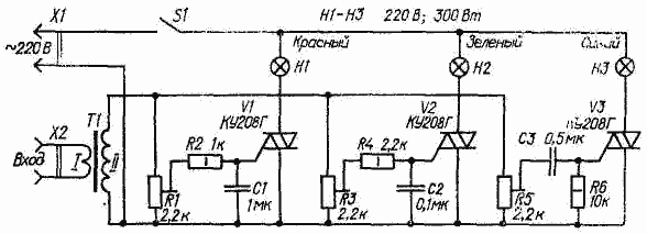 Установка (рис. V.27) - трехканальная. Сигнал звуковой частоты поступает на ее вход через повышающий трансформатор Т1, выполняющий также функции развязывающего элемента между выходом усилителя 34 и осветительной сетью. В установке применены простейшие частотные разделительные фильтры R2C1, R4C2 и R6C3.. Подстроечные резисторы R1, R3 и R5 - регуляторы чувствительности каналов.