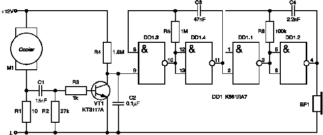 Устройство предназначено для подачи звукового сигнала при остановке вентилятора, охлаждающего центральный процессор ПК (т.е. кулера). Сигнализатор включается в разрыв кабеля питания кулера, размеры печатной платы 40x32.5 мм (умещается в спичечном коробке). Принципиальная схема сигнализатора изображена на рис.1.