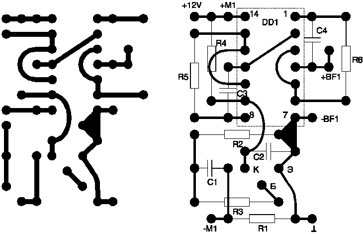 Работа устройства основана на особенности формы потребляемого кулером тока (риc.2). С резистора R1 снимается напряжение, пропорциональное току через кулер, с амплитудой импульсов около 2В. Фильтр C1R2 подавляет постоянную составляющую сигнала, чтобы в отсутствие импульсов транзистор VT1 был полностью закрыт. Каждый импульс тока (один оборот кулера) на короткое время открывает транзистор VT1, разряжая конденсатор C2. После окончания импульса транзистор закрывается, конденсатор C2 начинает постепенно заряжаться через R4, но при нормальной работе кулера к моменту прихода следующего импульса он успевает зарядиться незначительно, на входе 9 DD1 постоянно присутствует низкий уровень. При обрыве, заклинивании или замыкании кулера импульсы тока прекращают поступать на вход сигнализатора, транзистор VT1 постоянно закрыт, и конденсатор C2 заряжается (сопротивление резистора R4 подбирается так, чтобы установившееся напряжение на C2 уверенно распознавалось микросхемой как высокий уровень). Высокий уровень на входе 9 DD1 разрешает работу генератора, собранного на вентилях DD1.1-DD1.4 и формирующего прерывистый звуковой сигнал. Частота звука зависит от C4 и R6 (приведенные на схеме номиналы соответствуют приблизительно 2 кГц), частота прерывания звука - с помощью C3 и R5 (по схеме 9-10 Гц). В качестве излучателя звука можно использовать пьезоэлектрический капсюль (подобный используемым в электронных будильниках и телефонных аппаратах). Вариант печатной платы сигнализатора и монтажная схема приведены на рис.3 и 4 соответственно.