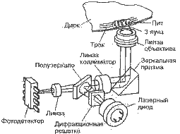 Луч лазера, отражается от призмы проходит сквозь фокусирующую линзу и падает на диск. Отразившись от диска, луч возвращается, проходит сквозь призму и падает на считывающий фотодетектор. Как видите, загрязнение линзы или призмы вдвойне ухудшают прохождение луча, так как два раза оказываются на его пути. Попадание грязи на оптику лазера является наиболее распространенной причиной прекращения нормальной работы CD-проигрывателя: аппарат "заикается", не "распознает" или не раскручивает диски.