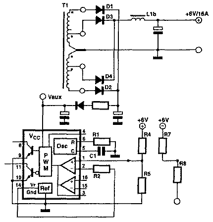 Типовая спецификация стандартного блока питания: +5 В/ 3...22А, +12 В/0,5...8 А, -12 В/0,5 А, -5 В/0,5 А. Рассмотренная схемотехника задает следующие требования к возможным модификациям: общая мощность всех нагрузок не должна превышать 200 Вт (это ограничения Q1, Q2, Т1); ток через любую из 12-вольтовых обмоток не должен превышать 4 А, а 5-вольтовых -10 А (ограничения катушек L1a/b и диодов D1-D4); каждая из половинок вторичной обмотки Т1 должна нагружаться симметрично, т.е. обязательно двухполупериодное выпрямление; соотношение напряжений пяти и 12-вольтовых выходов изменить невозможно ввиду фиксированного соотношения числа витков вторичных обмоток Т1 - абсолютные значения напряжений можно изменять на ±30%, или 3,5...6,5 В и 9...15 В, но их соотношение всегда будет равно 5:12. Пример 1: 6 В/16 А. Напряжение 6 В укладывается в 30%-ный коридор для 5-вольтового выхода, а 16 А соответствует (2х)8 А от каждого плеча выпрямителя, т.е. требования выполнимы.
