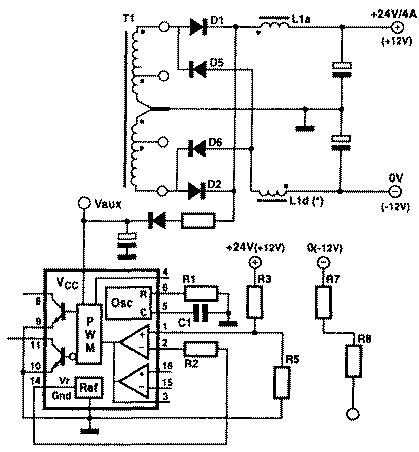 Схема для такого варианта показана на рис.2; здесь выходы +12/-12/-5 В с обрамлением устранены за ненадобностью. Выходное напряжение определяется резисторами R4 и R5. TL494 регулирует выход так, чтобы напряжения на ее выводах 1 и 2 (опорное 5 В) были равными, т.е. напряжение на R5 равно 5 В. Очевидно, что при этом напряжение на R4 равно 6-5=1 В и его сопротивление R4=R5(6B-5B)/5B. Если R5=4,7 кОм, то подходящее R4=1 кОм. Пример 2: 24 В/ 4 А. 24 В не укладывается в 30% коридор ни одного из стандартных напряжений, поэтому применим модификацию включения вторичных обмоток - рис.3. Здесь добавлены D5 и D6, формирующие напряжение -12 В. Перемаркируем -12 В в «общий», тогда +12 В станет +24 В (такой «фокус» возможен из-за гальванической развязки схемы от сети и нагрузки). Сопротивление R3=R5(12 В - 5 В)/5 В, т.е. если R5=3,3 кОм, то R3 = 4,7 кОм.