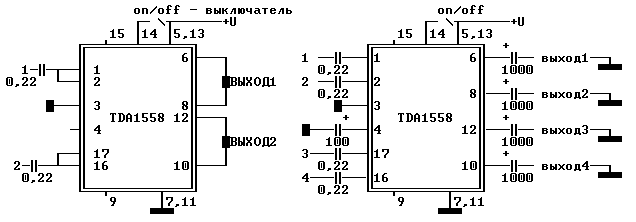 TDA 1558 - две схемы включения: 2*22W и 4*11W