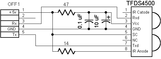 Подключается ИК-порт непосредственно к материнской плате, в большинстве случаев распиновка на плате соответствует схеме и описана в документации на плату, в случае не совпадения выводов их легко переставить. После установки необходимо включить в BIOS поддержку инфракрасного порта. ("Chipset Features Setup" -> "UART2 Use Infrared" -> "Enabled"). Если используется операционная система Windows 9X, то она сама установит необходимые для работы драйвера.