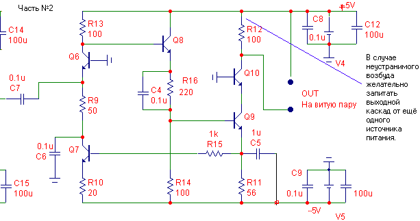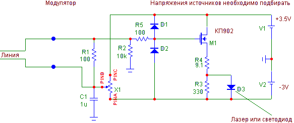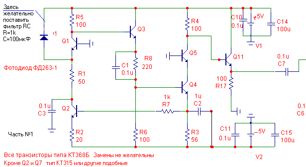Настольный - значит на "проводочках" на столе, не оформлен в корпус. Дистанция между светодиодом и фотодиодом 5 см, но интенсивность света такая-же, как и с дистанции 250 метров с 5-ти милливаттной указки. Макет очень "сырой" можете его не бомбить, я сам вижу всё его убожество, но он сделал главное - заработал. Через него я сидел в инете весь вечер, и отправлял письма. В сущности, усилитель собран из двух одинаковых модулей, объединённых эмиттерным повторителем. Построение из двух разделённых по постоянной составляющей модулей, уменьшило воздействте постоянного тока со светодиода от солнечных засветок, и дало возможность не разделять конденсатором фотодиод и вход усилителя, иначе пришлось бы ставить нагрузку на фотодиод, а это бы его шунтировало, т.е. уменьшило бы его отдачу, сказалось бы на частотной характеристике и т.д. В этом макете есть, по крайней мере, две изюминки: Из недостатков можно указать, что частотку валит он в два раза, т.е 5-ти мГц импульс он усиливает в два раза сильнее, чем 10-ти мГц. Видимо, с дистанции 250 метров он будет принимать сигнал (если будет) на ниточку - т.е. еле-еле. Не поставлены фильтры по питанию, а применены четыре источника питания, независимые и стабилизированные, но всё-едино он работает на грани возбуда. Но всё-же, отправная точка есть, плох макет или хорош - его можно доработать, а общие навороты и их размеры теперь ясны. У меня на подходе очередная модификация, улучшенная. Макет был включен в разрыв в витой паре, при этом, модулятор запускался сигналом от хаба, до него дистанция была 40 метров, приёмник работал через 10-ти метровый отрезок на приём в сетевой карте компа, а передача от компа на хаб шла по проводу. Так что связь получилась однобокой - на приём от хаба через свет, а на передачу через проволоку. Конструктивно макет был выполнен в экранирующей коробочке от блока ДМВ телевизора, правда эта коробочка оказалась тесноватой для такого количества деталей, можно применить коробку от СКМ или от СКВ. В качестве стоек я применил конденсаторы 0.1мкФ одним концом я паял их к корпусу, а к другому подпаивал выводы элементов "холодных" узлов (где нет высокочастотной составляющей) тем самым, я решил две проблемы: фильтрацию и крепёж. На схеме я не обозначил эти "стойки", но чем их будет больше, тем лучше. Можно также в качестве стоек применить мегомные резисторы - схема со средними токами и мегомы на режимах не скажутся. Вообще, надо применить максимальные меры против самовозбуждения, а к выводам питания подвязать дроссели (хороший тон!!!). Иначе, при возникновении возбуда будет потрачено много времени и сил - это одно из самых противных паразитных явлений после периодичеких возникновений дефектов (периодика). Вместо множества источников питания можно пробовать фильтры, но это уже отдельный разговор.