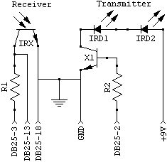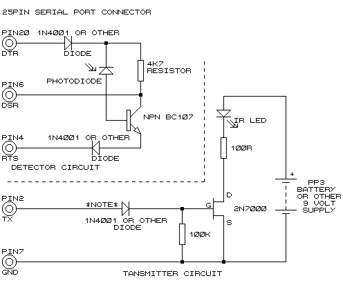 ![]() Это устройство позволяет установить связь на ИК лучах с любым бытовым устройством в вашей квартире имеющим ИК канал управления. Схема предназначена для компьютеров использующих все 25 контактов COM порта, а не 9. Можно найти соответствующие выводы и подключить к 9 контактному СОМ порту. Благодаря ему можно управлять с компьютера телевизором, видеомагнитофоном и т.д. Также позволяет вести обмен данными с другим компьютером, сотовым телефоном, лаптопом и др. Список необходимых радиодеталей: А вот еще одна схема. Датали можно подобрать аналогичные, главное принцип работы.