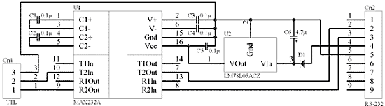 Рис. 1. Основу предлагаемого конвертера составляет широко распространенная микросхема преобразователя уровней MAX232A фирмы Maxim (U1), которая имеет также множество аналогов других производителей (Analog Devices, LG и др.). Данная микросхема рассчитана на напряжение питания 5В и имеет встроенные удвоитель и инвертор напряжения на переключаемых конденсаторах для получения напряжений +10 В, необходимых для работы с сигналами стандарта RS-232. Для работы микросхемы требуется 4 внешних конденсатора (C1, C2, C3, C4) емкостью 0.1 мкФ, которые используются в преобразователе напряжения. Кроме того, с целью упрощения использования данного конвертера в нем предусмотрена схема питания прямо от последовательного порта, что избавляет от необходимости использования внешних источников питания. Напряжение питания 5 В создается маломощным линейным стабилизатором напряжения LM78L05 (U2), вход которого подключен к накопительному конденсатору C6. Конденсатор C6 заряжается через диод от сигнала Data Terminal Ready (DTR, четвертый контакт 9-pin разъема RS-232). Диод D1 может быть любого типа (автор использовал диод в корпусе для поверхностного монтажа, выпаянный со сгоревшей материнской платы). Для нормальной работы такого преобразователя питания требуется, чтобы большую часть времени сигнал DTR имел значение логического нуля. Это должно обеспечиваться используемой терминальной программой или программой пользователя. Использование описанного выше конвертера оказывается удобным в тех случаях, когда в процессе эксплуатации устройства не требуется наличие возможности связи с компьютером, но она нужна на этапе отладки или изготовления устройства. Типичным примером этого может служить, например, устройство с flash или EEPROM памятью, требующей начальной инициализации. Кроме того, часто бывает очень удобно в процессе разработки выводить в последовательный порт различного рода отладочную информацию, что иногда позволяет обойтись без аппаратных эмуляторов.
