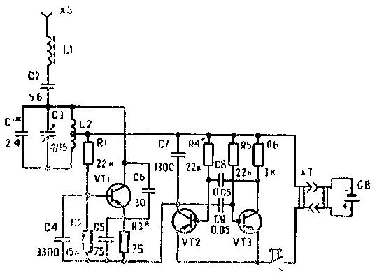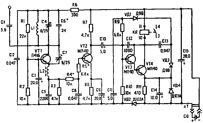 Рис.1 Генератор высокой частоты собран на транзисторе VT1 типа П416 по схеме с емкостной обратной связью. При открытом транзисторе модулятора VT2 цепь генератора замыкается на плюс батареи, генератор возбуждается на рабочей частоте, сигнал высокой частоты излучается антенной. Приемник состоит из высокочастотного каскада, усилителя низкой частоты и электронного реле. Высокочастотный каскад приемника представляет собой сверхрегенератор. Сверхрегенератор собран на высокочастотном транзисторе VT1 типа П416 (рис.2).