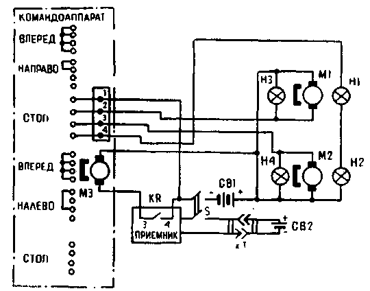 Рис.3 Для приема сигналов команды от передатчика в игрушку вмонтированы приемник и Командоаппарат. Двигатель привода и командоаппарата, а также лампочки питаются от двух последовательно соединенных батарей типа 3336Л(У) (GB1). Для питания приемника служит батарея "Крона-ВЦ" (GB2). Для выключения батареи служит двухполюсный выключатель S. При поступлении сигнала команды от передатчика срабатывает реле КР, приемника и своими контактами включает электродвигатель командоаппарата (рис.4)МЗ.