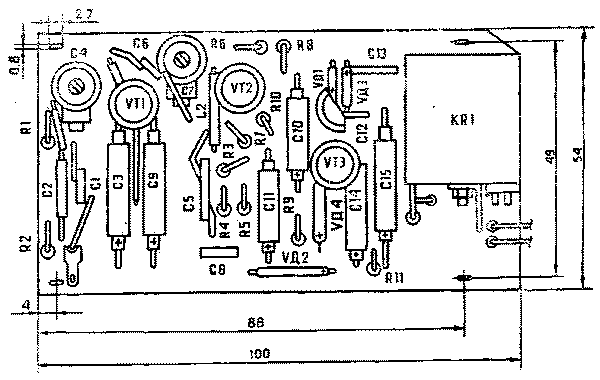 Размещение приемника в игрушке желательно производить на максимальном удалении от эл. двигателей и электромагнитов. Для защиты приемника от помех, создаваемых электродвигателями, рекомендуется включать параллельно электродвигателям электролитические конденсаторы 10-20 мкф рабочим напряжением 10-12 вольт, соблюдая полярность включения. К приемнику необходимо подключить антенну. В качестве антенны может быть использован штырь или провод диаметром 1,0-2,0 мм, длиной не менее 20 см. Антенну необходимо изолировать от корпуса игрушки. В качестве изоляторов можно использовать детали из керамики, фторопласта, оргстекла или полистирола. С увеличением длины антенны дальность управления увеличивается. Приемник необходимо закрыть крышкой из изоляционного материала для защиты от пыли и влаги. Расстояние от печатной платы до основания, на котором укреплен приемник, должно быть не менее 5 мм. После монтажа электрической схемы и проверки работоспособности (порядок включения указан далее) необходимо подстроить приемник на максимальную чувствительность. Подстройка производится с помощью конденсатора С4 (см. принципиальную схему и чертеж приемника). Поворачивая ротор конденсатора изоляционной отверткой, необходимо найти положение, при котором срабатывание реле происходит при максимальном удалении игрушки ог передатчика. Командоаппарат закрепляется на горизонтальной платформе с помощью лапок.