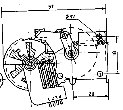 Рис.4. Командоаппарат Электродвигатель МЗ с помощью храпового механизма поворачивает программный диск на 30°, что соответствует переключению одной команды. Программный диск через распределительные скользящие контакты включает электродвигатели привода и лампочки игрушки следующим образом: В положении "вперед" замкнуты контакты 1, 2, 3, 4, при этом включены двигатели М1 и М2, а также лампочки Н1, Н2, НЗ, Н4. В положении "направо" замкнуты контакты 1, 2, при этом включены двигатель М1 и лампочка НЗ. В положении "стоп" все контакты разомкнуты. В положении "налево" замкнуты контакты 1, 3, при этом включены двигатель М2 и лампочка Н4. Команды меняются периодически. На схеме показана последовательность команд за один цикл. Указания по монтажу и наладке системы