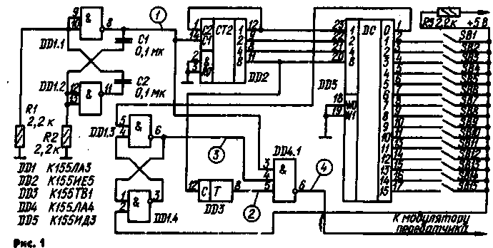 На выходе шифратора команд действуют пачки импульсов отрицательной полярности (график 4 на рис. 3). Частота повторения пачек импульсов равна f/32, где f — частота задающего генератора, выполненного на логических элементах DD1.1.DD1.2 (рис. I) по схеме симметричного мультивибратора. С задающего генератора импульсы (график 1) поступают на счетчик DD2 и на элемент совпадения .DD4.1. Импульсы частотой f через этот элемент будут проходить тогда, когда триггеры DD3 и DD1.3.DD1.4 находятся в единичном состоянии (графики 2 и 3). Счетный триггер DD3 переключается после каждого 16-го импульса, поступающего на счетчик DD2. Свободные входы триггера DD3 объединены и подключены через резистор сопротивлением 1 кОм к плюсовому выводу источника питания. RS-триггер DD1.3.DD1.4 устанавливается в единичное состояние по нулевому уровню сигнала на выходе 0 (вывод 1) дешифратора DD5 и в нулевое состояние — по нулевому уровню сигнала на том из выходов дешифратора, который подключен к выводу 2 элемента DD1.4 через контакты одной из кнопок SB I—SB 15. Число импульсов в пачке равно номеру нажатой кнопки. Если не нажата ни одна из кнопок, то шифратор вырабатывает пачки по 16 импульсов, так как RS-триггер DD1.3.DD1.4 не переводится в нулевое состояние.