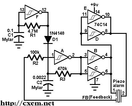 This circuit uses a 74C14 to form a beeper that produces a 100 dB
