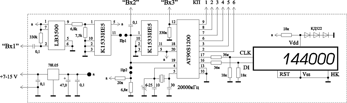 В режиме цифровой шкалы устройство работает с приемниками имеющими ПЧ: 455 кГц, 465 кГц, 500 кГц, 10695 кГц, 10700 кГц, 21000 кГц, 24000 кГц. Предусмотрен выбор +ПЧ или -ПЧ. Возможна индивидуальная прошивка под любые другие ПЧ. Основу прибора составляет программируемый микроконтроллер AT90S1200-12SI фирмы ATMEL. Контроллер управляет ЖКИ дисплеем HT-1611 и в зависимости от установленных перемычек работает как частотомер или цифровая шкала. Для питания микросхем применяется стабилизатор напряжения 78L05, что обуславливает нижний предел питающего напряжения не ниже 7В. Если необходимо уменьшить нижний предел питающего напряжения вплоть до 5В, следует заменить стабилизатор 78L05 на LM2931Z5. Для работы со входа 1 на частотах до 200 МГц используется высокочастотный делитель LB3500 фирмы SANYO, благодаря которому чувствительность в диапазоне 1...200 МГц не хуже 50 мВ. При работе на низких частотах (вход 3) 0...1 МГц используется внутренний компаратор микроконтроллера, что обеспечивает высокую чувствительность и уменьшает габариты платы. Все детали прибора умещаются на плате размером 65х35 мм. Микроконтроллер устанавливается со стороны печатных дорожек. ЖКИ дисплей впаивается в плату со стороны деталей. При этом высота прибора вместе с индикатором не превышает 20 мм. Описание режимов работы: