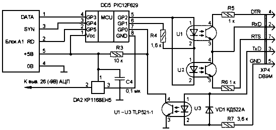 Питание осуществляется от внешнего источника напряжением 9...15 В. Разъемы ХР2 и ХРЗ соединяют с помощью плоского ленточного кабеля, имеющего соответствующие ответные разъемы — IDC-10F. Вилка ХР2 может отсутствовать, если кабель подключен непосредственно к порту. При отключенном разъеме ХР2 микросхемы DD1—DD3 обесточены, и мультиметр можно использовать обычным образом. Управление передачей данных полностью осуществляется компьютером. Исходный код управляющей программы для DOS находится в файле mjpt.cpp архива программ. Приведенный вариант блока не имеет гальванической развязки, поэтому использовать его следует с большой осторожностью. Попадание в порт LPT, например, напряжения 30В при пробое в микросхеме АЦП может вывести из строя материнскую плату. Для устранения этого недостатка была разработана более сложная схема блока передачи данных (рис. 3). Он представляет собой микроконтроллерный блок, имеющий гальваническую развязку и осуществляющий передачу данных по последовательному каналу RS232. Применение однокристального микроконтроллера позволило максимально снизить энергопотребление и уменьшить габариты. Микроконтроллер PIC12F629 имеет 1024 слова FLASH памяти программ, 64 байта памяти данных, 6 портов ввода/вывода, внутренний генератор тактовой частоты 4 МГц. Он не имеет аппаратного приемопередатчика (USART), поэтому протокол RS232 воспроизводится программно.