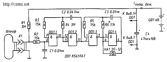 На рис. 83 приведена принципиальная схема устройства, формирующего тревожный акустический сигнал при обрыве шлейфного датчика. На элементах DD1.1 и DD1.2 собран коммутирующий генератор с частотой переключения fп=1/2R4·С2@2...3 Гц, а на DD1.3 и DD1.4 - тональный генератор, возбуждающийся на частоте fт=1/2R6·C3@1 кГц. Пьезоэлемент НА1 - нагрузка тонального генератора, GB1- гальваническая батарея.
