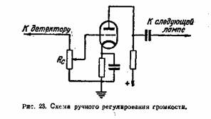 В большинстве приемников усилитель низкой частоты (УНЧ) бывает двухкаскадным и состоит из предварительного усилителя, собранного по реостатной схеме, и оконечного каскада. Усиление должно быть достаточным для получения полной выходной мощности при включении на вход звукоснимателя. В предварительном усилителе чаще всего используются триодиая часть лампы 6Г2, двойной триод 6Н2П, а иногда высокочастотный пентод 6Ж7, 6Ж8, 6Ж3П или другая, близкая к ним лампа. Такая схема при правильном выборе элементов позволяет получить хорошую частотную характеристику. При использовании высокочастотных пентодов напряжение на экранирующей сетке уменьшают против нормального режима, так как изза наличия сопротивления в анодной цепи уменьшается значение действующего напряжения на аноде лампы. Регулировка громкости производится посредством изменения величины напряжения низкой частоты, подаваемого на управляющую сетку первой лампы усилителя. В простейшем виде схема такого регулируемого каскада показана на рис. 23. Здесь полное напряжение низкой частоты, снимаемое с детектора, подается на высокоомный потенциометр Rc, а к сетке усилительной лампы подводится только необходимая часть этого напряжения.
