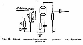 Чтобы устранить это явление, в лучших приемниках применяется так называемая компенсированная регулировка громкости. Одна из простых схем этого рода приведена на рис. 24. Здесь от части сопротивления Rc сделан отвод, к которому подключены сопротивление Rk (10—30 ком) и последовательно с ним конденсатор Ск (0,005 — 0,02 мкф). Эта цепь, шунтирующая часть сопротивления Rс, обладает разными сопротивлениями для различных частот; для низших звуковых частот они велики и определяются реактивным сопротивлением конденсатора Ск и сопротивлением Кс а для высших—только сопротивлением Rк. Таким образом, нижний участок сопротивления Rc шунтированный цепью Ск и Rk, будет иметь большое сопротивление для низших звуковых частот и малое для высших. Когда движок сопротивления Rc находится вблизи верхнего конца а, на сетку лампы попадает почти все напряжение и отвод от сопротивления значения не имеет. Если же для уменьшения громкости движок передвинут вниз, в точку б, то к сетке лампы подводится часть напряжения с участка бв. Как уже было указано, сопротивление этого участка будет различным для разных частот.