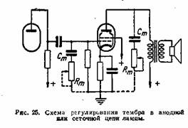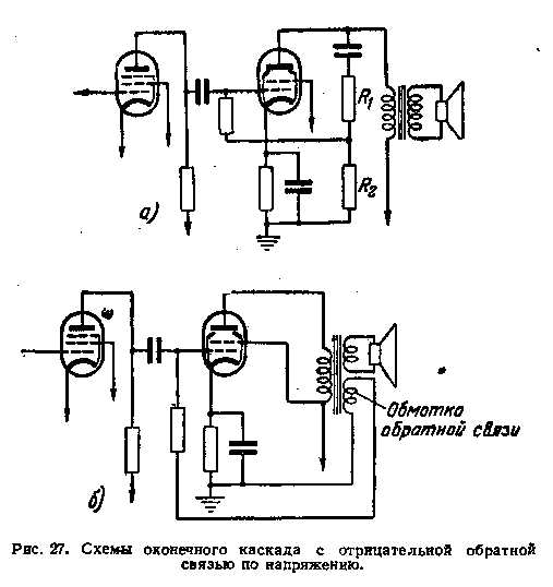 Широкое распространение в современных радиоприемниках получила отрицательная обратная связь, которая позволяет существенно улучшить качественные показатели и уменьшить всякого рода искажения в усилителе низкой частоты. Наиболее широко используются схемы так называемой обратной связи по напряжению, когда часть выходного напряжения, снимаемая с сопротивления R2 (рис. 27,а) или с обмотки выходного трансформатора (рис. 27,6), подается обратно на вход усилителя и включается последовательно с напряжением сигнала, но в обратной фазе по отношению к нему, т. е. навстречу сигналу. Общее усиление при этом уменьшается, но одновременно заметно снижаются и все основные виды искажений. ![]() Во многих приемниках при помощи отрицательной обратной связи осуществляется изменение формы частотной характеристики усилителя, т. е. регулирование тембра звучания. Для этого цепь отрицательной обратной связи делается частотнозависимой. Так, например, если в схеме на рис. 27,а сопротивление R2 шунтировать емкостью, то на верхних частотах звукового диапазона сопротивление этого плеча делителя выходного напряжения уменьшится, а следовательно, уменьшится и величина и напряжения отрицательной обратной связи на входе. Поэтому, усиление на этих частотах упадет в меньшей степени, чем на более низких, и у частотной характеристики получится подъем в области верхних частот. Если, наоборот, шунтировать емкостью сопротивление R1, картина будет обратной: произойдет подъем в области низких частот. Такая возможность корректирования частотной характеристики широко используется во многих радиовещательных приемниках, причем для этого применяются самые различные схемы.