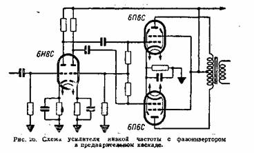 Тембр воспроизводимой звуковой программы регулируют при помощи переменного сопротивления Rт, включенного последовательно с конденсаторам Cт в цепь анода оконечной лампы (рис. 25). При уменьшении сопротивления Rт цепь RтCт будет представлять большое сопротивление для низших звуковых частот и малое — для высших. Выходной трансформатор окажется сильно шунтированным для высших частот, что вызовет ослабление в области высших частот, и они будут воспроизводиться с меньшей громкостью. Изменяя величину сопротивления Rт, можно регулировать тембр воспроизведения. Ограничение частотной характеристики приемника со стороны высших частот несколько уменьшает помехи при приеме, а также ослабляет шипение при проигрывании граммофонных пластинок. Аналогичным же образом может быть осуществлена регулировка тембра и в цепи управляющей сетки лампы. В этом случае цепь Rт Cт шунтирует анодную нагрузку предыдущей лампы. В оконечном каскаде используют главным образом лучевые тетроды типа 6П6С, 6ПЗС, 6П1П или 6П14П. В более старых моделях приемников в этом каскаде встречаются пентоды 6Ф6С. В оконечном каскаде высококачественных приемников для повышения отдаваемой полезной мощности нередко применяют двухтактные схемы, которые, кроме того, позволяют уменьшать искажения на выходе, так как при правильно выбранном режиме работы ламп в двухтактной схеме четные гармоники, составляющие обычно значительную часть общих искажений усилителя, исключаются. При двухтактной схеме оконечного каскада предварительный усилитель должен создавать поворот фазы напряжения на управляющей сетке одной из ламп по отношению к напряжению на сетке другой его лампы на 180°. Наиболее широкое применение в приемниках находят для этой цели схемы с двойными триодами (6Н7С, 6Н8С, 6Н9С, 6Н1П, 6Н2П), где один из триодов используется в качестве обычного усилителя на сопротивлениях, а другой — в качестве фазоинвертора. Напряжение низкой частоты на управляющую сетку одной из оконечных ламп подается с анодной нагрузки первого триода. Часть этого же напряжения поступает на сетку второго триода, и в его анодной цепи получается усиленное напряжение, сдвинутое по фазе на 180° по отношению к напряжению на сетке. Это усиленное напряжение подается на управляющую сетку другой лампы оконечного каскада. Одна из схем такого рода (так называемая самобалансирующаяся фазоинверсная схема) приведена на рис. 26.