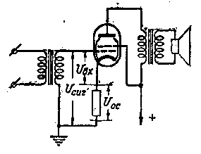 Рис. 28. Схема отрицательной обратной связи по току. Другую разновидность представляют схемы отрицательной обратной связи по току, в которых величина обратной связи пропорциональна переменному току на выходе. На рис. 28 показана схема оконечного каскада с использованием отрицательной обратной связи такого вида. Для этого достаточно удалить конденсатор, шунтирующий сопротивление в цепи катода. Схемы отрицательной обратной связи в приемниках чрезвычайно разнообразны. В простейшем виде они находят применение в приемниках 3-го класса, а в более сложном виде — в приемниках 2-го и 1-го классов.
