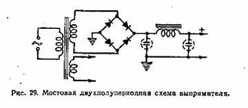 В сетевых приемниках переменного тока применяется главным образом схема двухполупериодного выпрямления на кенотроне и реже — схема однополупериодного выпрямления. Более поздние модели приемников имеют выпрямитель, собранный по мостовой двухполупериодной схеме на селеновых столбиках (рис. 29). Такая схема удобна тем, что не требует вывода от средней точки вторичной обмотки силового трансформатора и легко позволяет избавиться от пульсаций в выпрямленном напряжении.