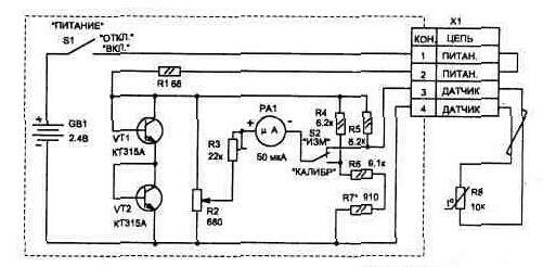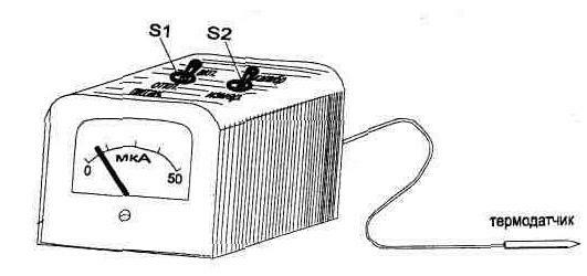 Рис. 1.13. Внешний вид конструкции Рис. 1.14 автоматическим поддержанием заданной температуры, куда и помещают термодатчик. Возможны и другие способы получения температуры 20°С но надо учитывать, что от точности измерения сопротивления термодатчика при этой температуре зависит точность измерения прибора. После измерения R8 из двух резисторов R6+R7 подбираем такой же номинал сопротивления и припаиваем их в схему. После этого, установив движки резисторов R2 и R3 в среднее положение, включаем схему тумблером S1 и выполняем последовательно следующие операции: а) установить переключатель 82 в положение КАЛИБРОВКА и резистором R2 вывести стрелку измерительного прибора в нулевое положение на шкале; б) поместить датчик температуры в место с известной, постоянной температурой (в пределах желаемого измерительного диапазона); в) установить переключатель S2 в положение ИЗМЕРЕНИЕ и резистором R3 установить стрелку прибора на значение шкалы, которое будет соответствовать измеренной величине; Операции а), б) и в) необходимо повторить последовательно несколько раз, после чего настройку можно считать законченной. В заключение хотелось бы отметить, что в настроенном приборе диа пазон измерения можно сдвинуть резистором R2 при переключении в режим КАЛИБРОВКА и устанавливая стрелку (ее положение будет соответствовать значению 20°С) на любое значение шкалы. После этого при переключении прибора в режим ИЗМЕРЕНИЕ шкала будет соответствующим образом сдвинута относительно положения стрелки в режиме КАЛИБРОВКА. Прибор имеет большой запас по чувствительности,