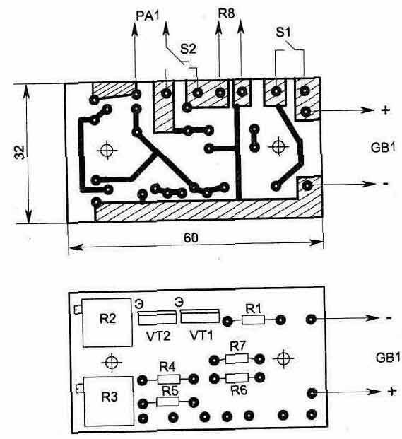 Каждому приходилось во время болезни измерять себе температуру ртутным термометром. Эта процедура занимает обычно 5...7 минут. Если взрослые держат градусник спокойно, то за детьми приходится наблюдать, чтобы они его случайно не сломали. Предлагаемое устройство позволяет за 3 секунды измерить темпера туру тела или предмета (например микросхемы) в диапазоне от 20 до 45°С с точностью не хуже 0,1°С. Этот диапазон при желании легко можно расширить или сдвинуть при изготовлении. По сравнению с ртутным термометром электрический более удобен и безопасен, особенно когда приходится измерять температуру у маленьких детей или у животных. Рис. 1.12. Электрическая схема термометра В основу по строения схемы (рис. 1.12) взят мостовой преобразователь. Изменение величины сопротивления термодатчика R8 приводит к разбалансу моста и появлению на стрелочном индикаторе РА1 тока, пропорционального температуре. Особенностью данного прибора является применение в качестве датчика температуры терморезистора типа СТЗ-19 10 кОм, который обладает очень малой массой, за счет чего и удается получить высокую скорость измерения. Этот датчик удобно закрепить на конце пластмассовой трубки от шариковой авторучки и перевитыми между собой проводами длиной 1...0.6 м через разъем Х1 подключить к измерительному блоку. На разъеме от датчика между контактами 1 и 2 установлена перемычка, которая не позволит включить схему устройства, если не подключен термодатчик, что предохраняет измерительный прибор РА1 от повреждения. Питается схема от двух любых аккумуляторов или батареек с общим напряжением 2...3 В и потребляет от источника ток не более 5 мА. Транзисторы VT1 и VT2 используются как низковольтные стабилитроны и могут быть заменены на КТ3102А, Б, В, Г. Переменные резисторы, для удобства настройки, лучше применить многооборотные, типа СП5-2 или аналогичные. Габариты устройства определяются размерами стрелочного индикатора РА1, и при использовании микроамперметра М4205 на ток 0...50 мкА они не превышают 85х65х60 мм (см. рис. 1.13). Топология печатной платы и размещение на ней элементов показаны на рис. 1.14. Настройку прибора начинают с измерения сопротивления резисто ра R8 (желательно с высокой точностью) при фиксированной температуре 20°С. Для этих целей удобно воспользоваться промышленной термокамерой с